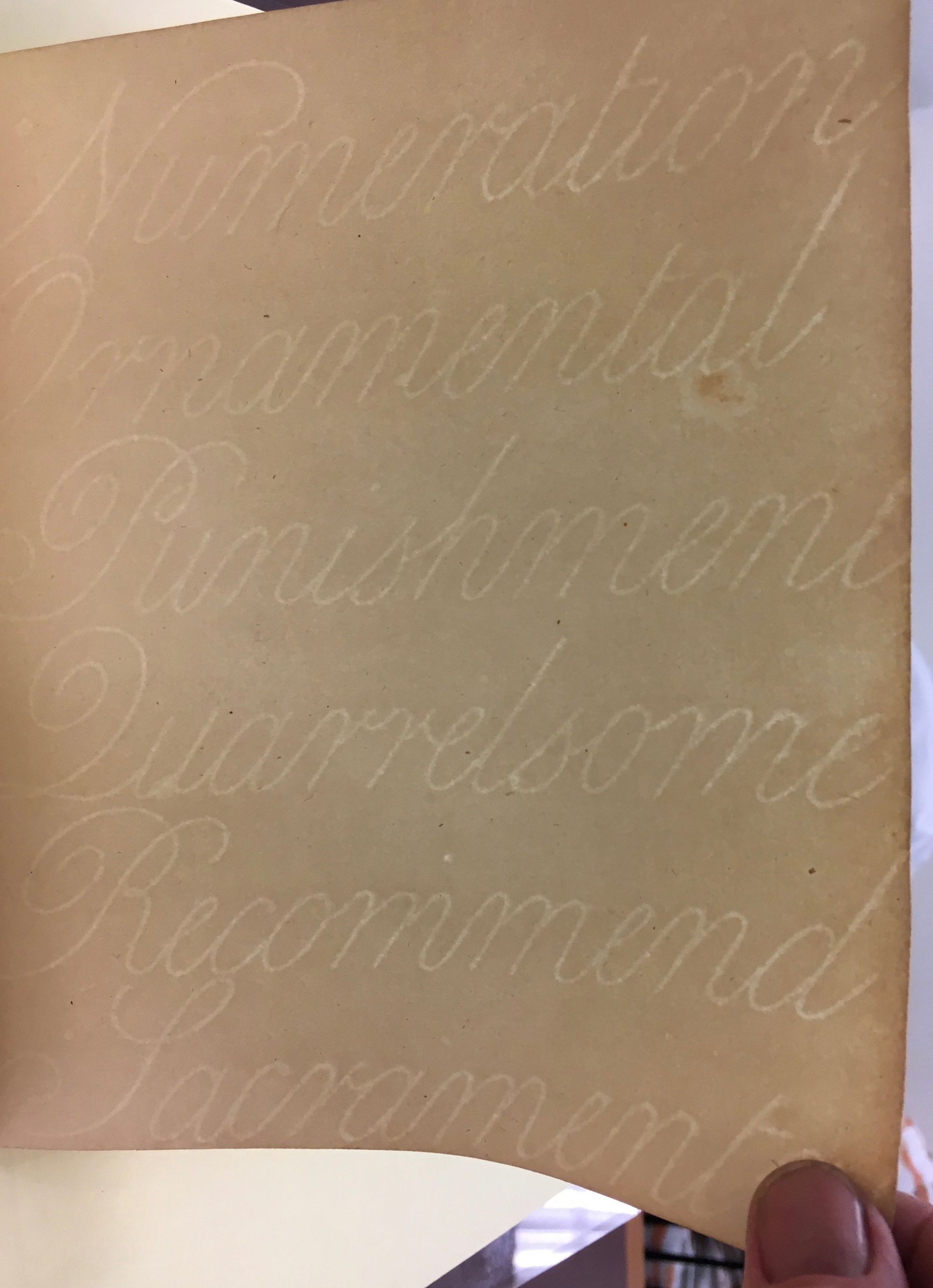 But, there, faintly in the paper were letterforms, subtly ranging down the page, just like a printed copybook. Looking at the sheet with the plants, some late 19th century notes, I was attempting to decipher what I was looking at. But then, I was instructed to begin to turn the page - only to discover that those letters were watermarks, quite clearly a part of the papermaking.