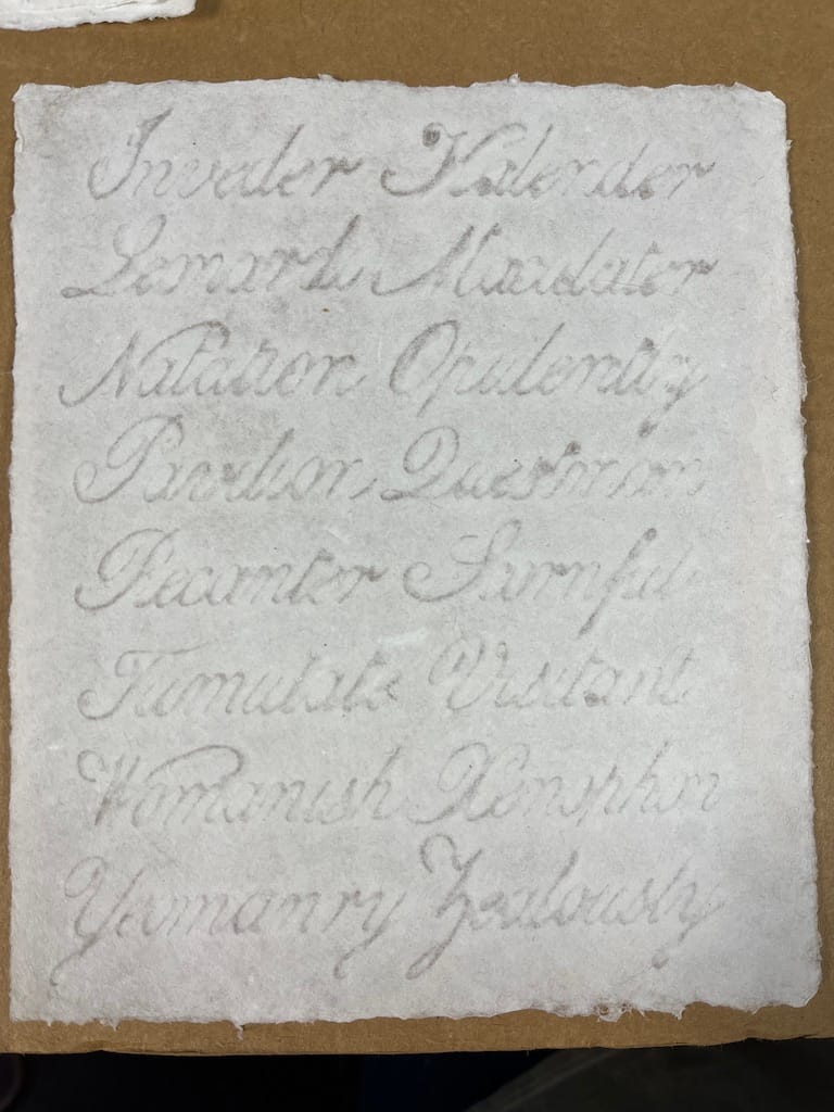 This year my chapter on Joseph Seavy's watermark illustrated manual, The writer's assistant: containing copies in water lines, for the improvement of youth in penmanship was published in Papermaker's Tears V. 2 by The Legacy Press. I've written about Seavy here in the past; and this book presents my work to date. I made replica sheets of paper with the watermarked letterforms for each copy of the book. The watermarks were 3D printed at MagnoliaEditions, which has been instrumental in allowing me to produce my ideas.