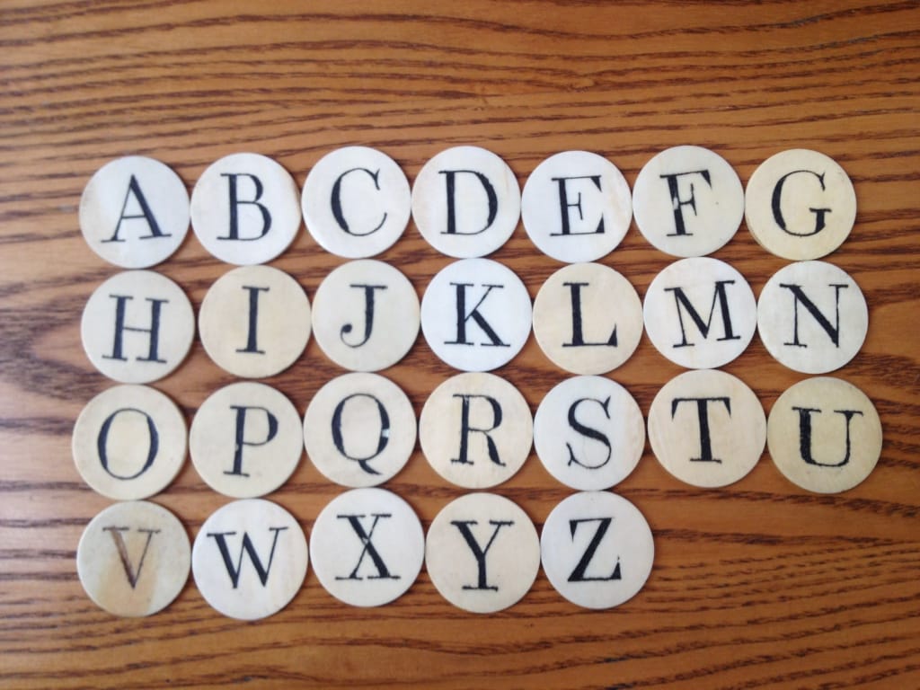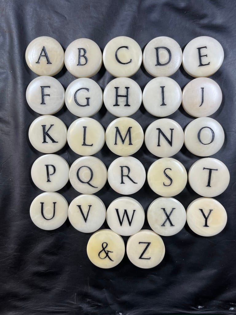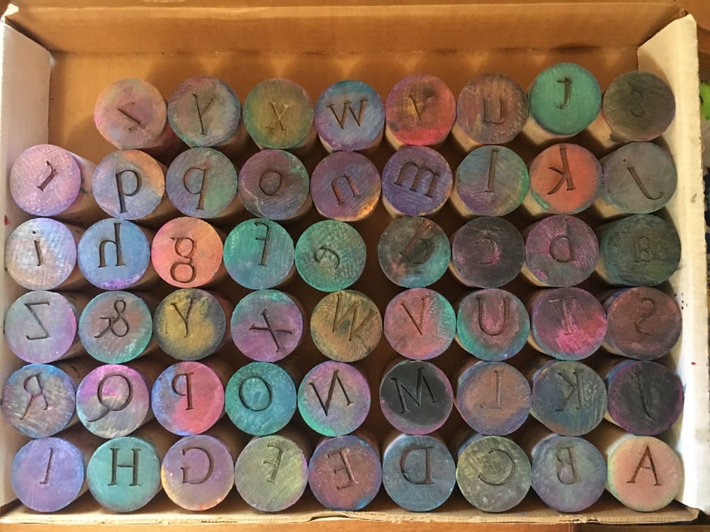 On my original 2015 trip, I called up some ivory letters from Princeton's Cotsen Library. I'm still excited by making tactile things – even if they aren't books. This year, Nicholas Price at Magnolia helped me get the digital files in order to make vegetable ivory Alphabet Realia coins. Then he laser-cut the letters into the tagua nut disks. I took them home and did an intaglio wipe with acrylic paint to color the letters. I'm satisfied with this version – I want to touch them, play with them, maybe even arrange them into words!