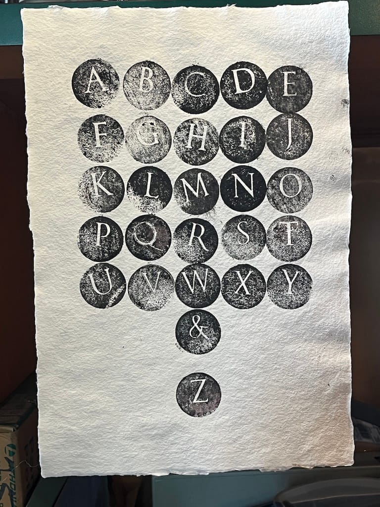 While that has been the focus of much of my research and craft effort, I've worked at a conceptual/functional art piece called Percussive Roman the whole time. It is a post-digital monotype impression system that is ideal for one-off printing. In 2019, Don Farnsworth at MagnoliaEditions agreed to trade my bookbinding skills for laser-cutting my letters into maple dowels.